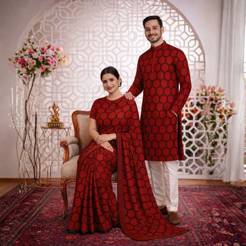🔸 হুবহু মিল থাকা শাড়ি ও পাঞ্জাবিতে ফুটে ওঠে জুটির গল্প