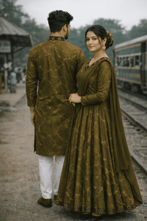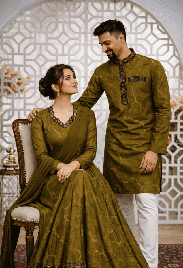 Elegant Olive Green Matching Couple Dress Set – Punjabi & Gown (Code: 102)